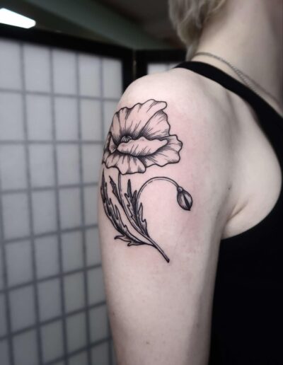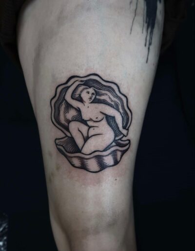Matilde specializes in engraving-style blackwork tattoos, blending fine lines with classic, art-inspired designs. Based in Aarhus, she creates timeless, elegant pieces.